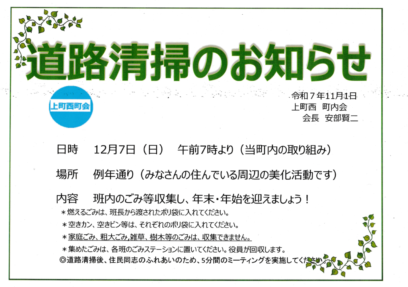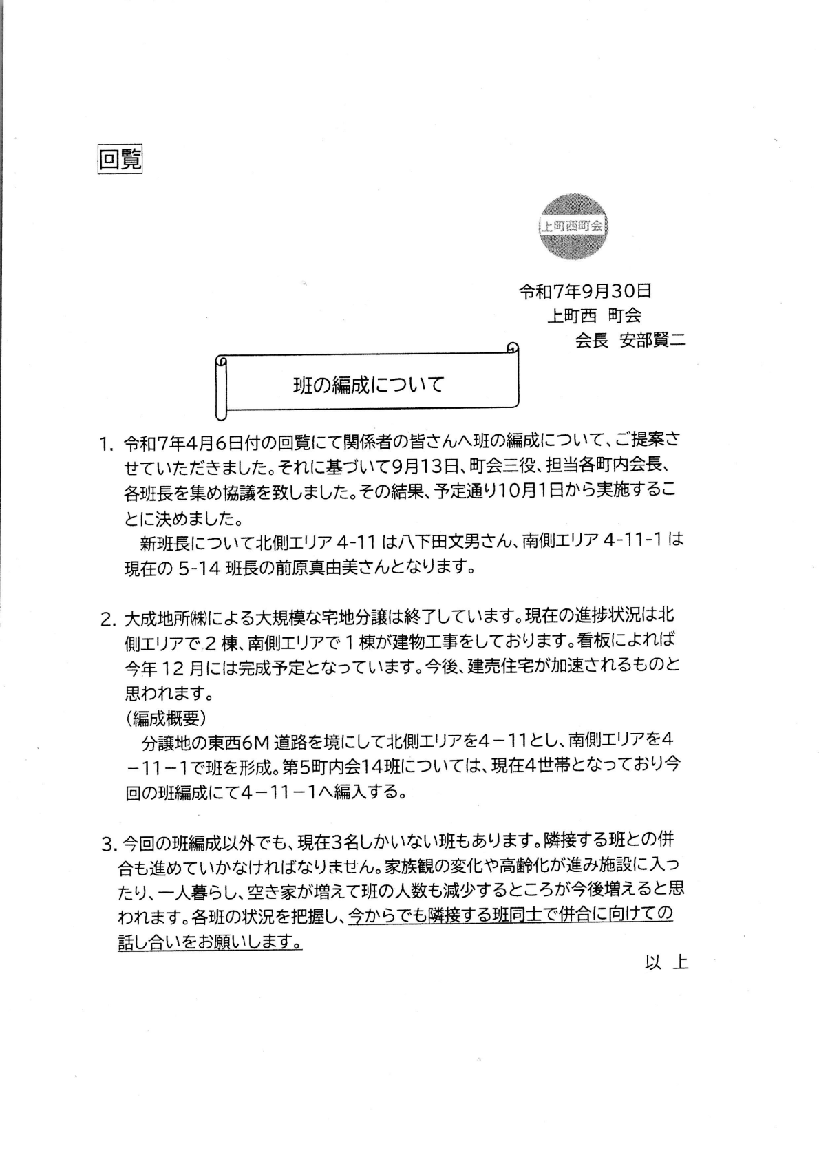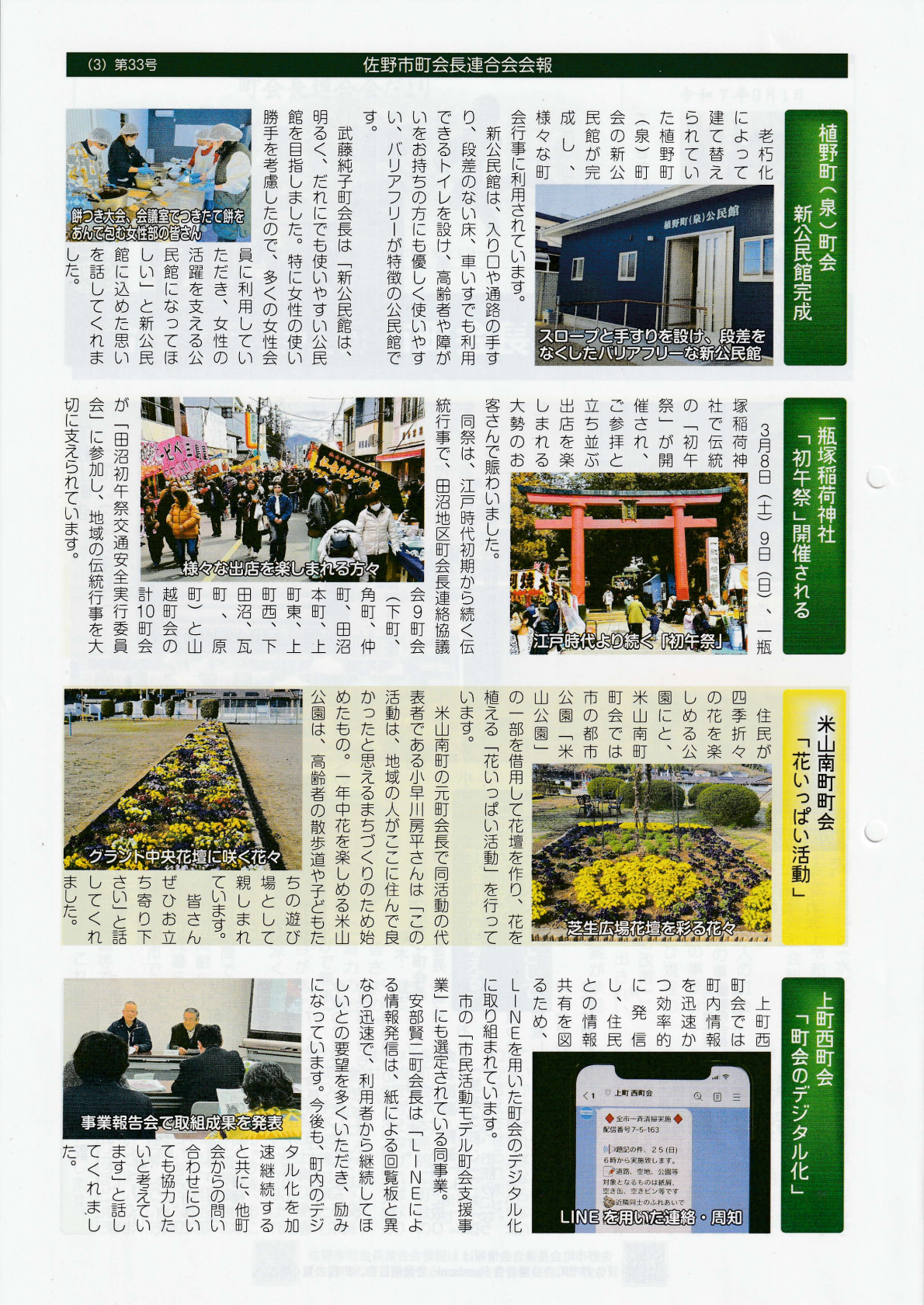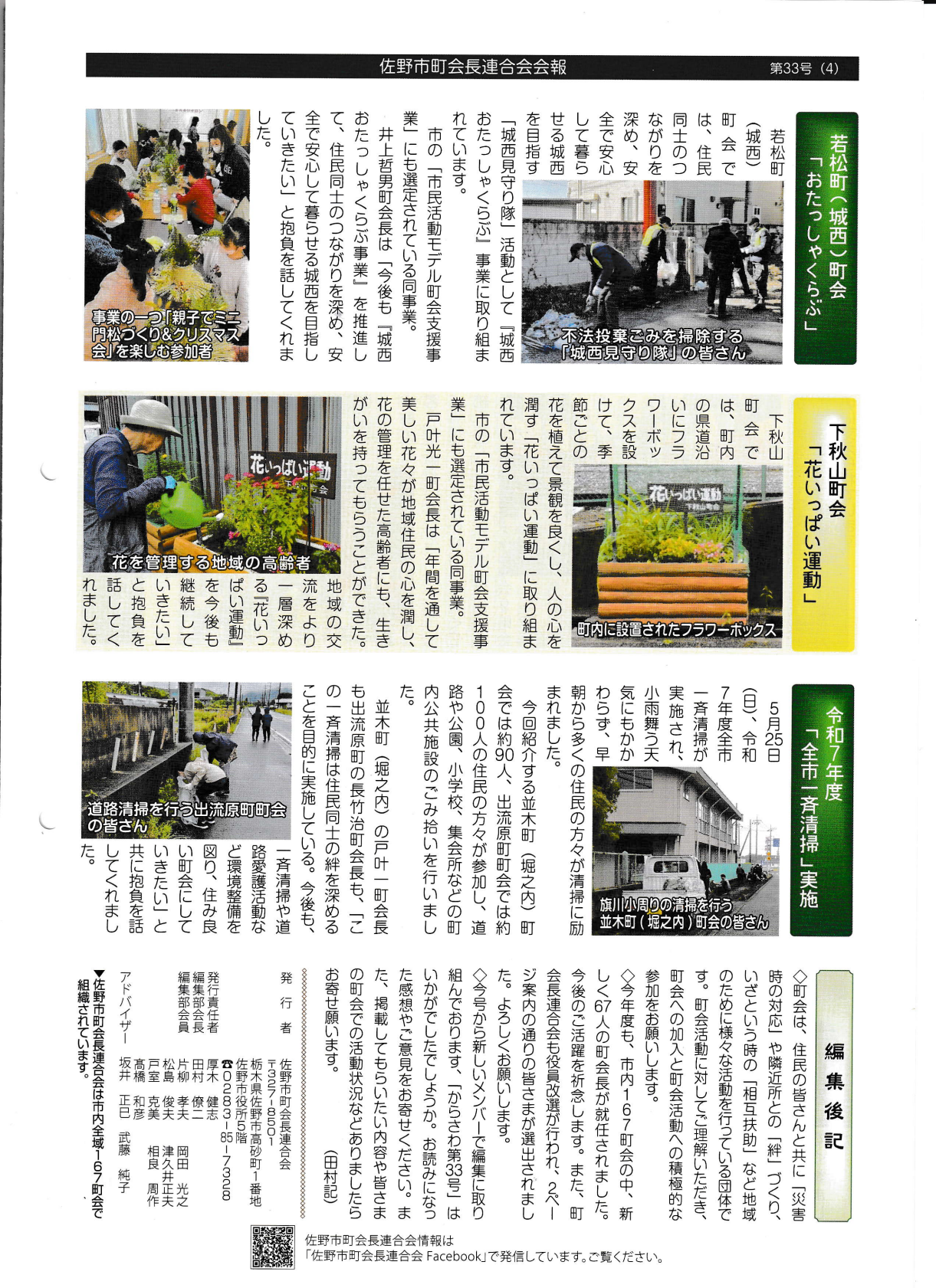 町内の地域情報の共有化。さらに治安・防災も大事なことです。自警団防災会が大活躍しています。また子供たちの通学時見守りも育成会を中心に実施されています。孤独死の事例がみられます。高齢化社会は進んでいます。お互いに助け合いながら、ふれあいを大切に,住み良い町づくりにしましょう。