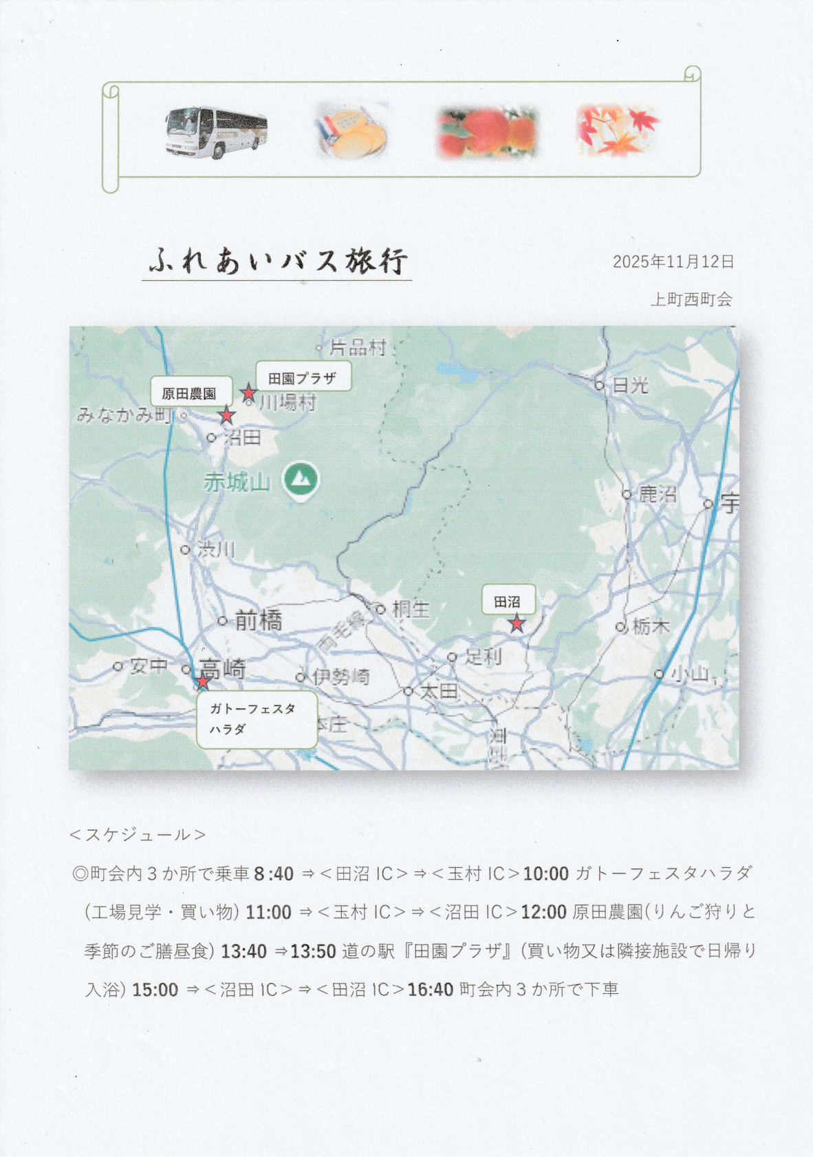 令和7年11月12日 ふれあいバス旅行は、11月12日(水)8時半発、行先は高崎、沼田、川場方面で実施しました。参加者は24名でした。